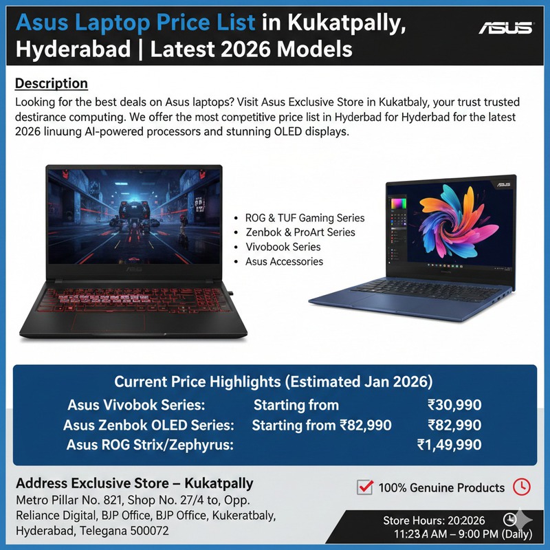 Looking for the best deals on Asus laptops? Visit the Asus Exclusive Store in Kukatpally, your trusted destination for high-performance computing. We offer the most competitive price list in Hyderabad for the latest 2026 lineup, featuring AI-powered processors and stunning OLED displays.
